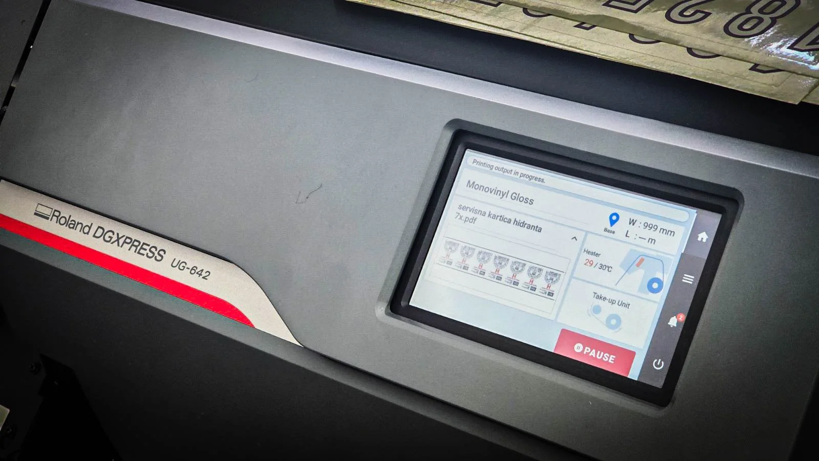 Za štampanje na samoljepivim folijama koristimo napredne uređaje marke Roland, sa kojima smo u stanju da proizvedemo kvalitetne proizvode koje su otporni i dugovječni protiv vanjskih uvjeta.